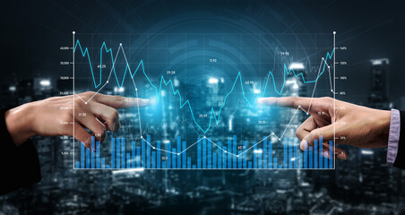 Data visualization, financial trends and stock market analysis with dynamic graphs and digital technology on screen for investment strategies and forecasting.