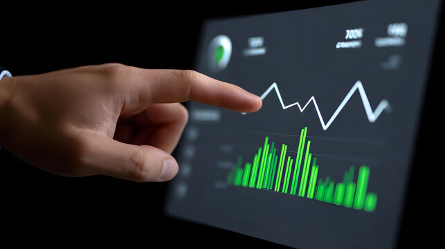 Digital finger interacting with data visualization on a touchscreen display. Business success.