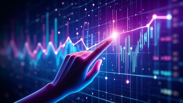Colorful data visualization shows financial fluctuations with vibrant bars and lines on a digital backdrop