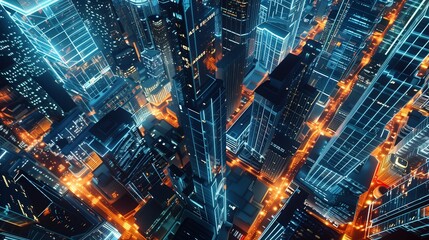 an aerial view of a futuristic financial district at night, where buildings are interconnected with glowing data streams