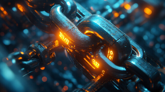 Post apocalyptic blockchain future glowing chains Bitcoin illuminating devastated cityscape resilience technological persistence hacker data money finance connection link invest global fiction sci-fi