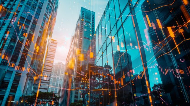 Digital financial data displayed over glass office buildings