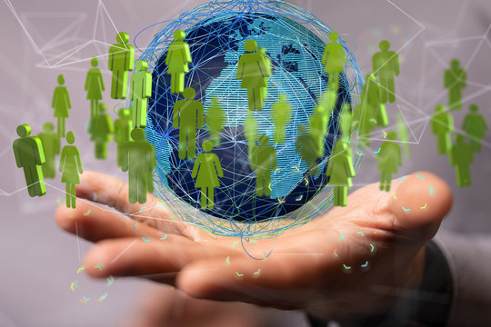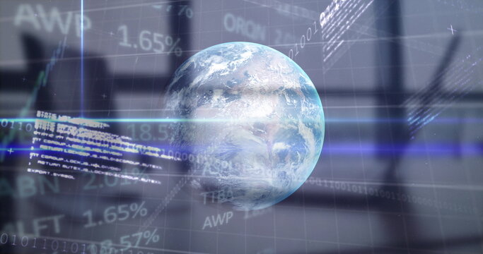 Digital hologram of the Earth with satellites on orbit. Digital globe with statistics data..