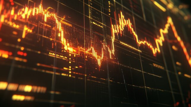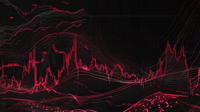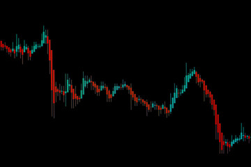 Stock chart of the falling market on a black background. Background chart of stock financial data to overlay on the screen. The graph of the fall. Red and green Japanese stock candlesticks on black