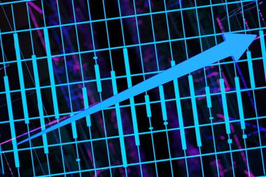 A vibrant blue arrow ascends sharply across a gridded background overlaid with blurred candlestick charts, suggesting upward financial growth or technological advancement.