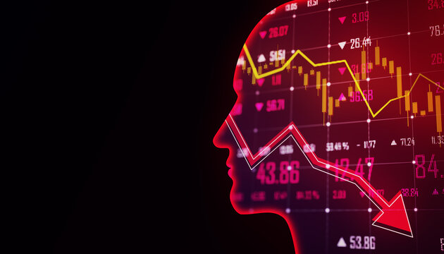 Silhouette of a head with stock market decline graph overlay, red and black tones, digital concept of financial crisis. 3D Rendering