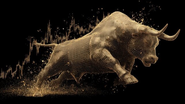 A golden, wireframe bull statue bursts forward with energy, overlaid with stock market data against a black background