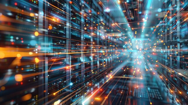 High tech data center aisle with server cabinets, blinking leds, and digital overlays for automation