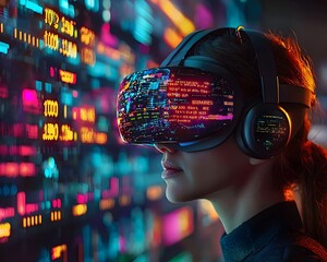 Person using virtual reality headset to navigate futuristic finance and investment interfaces