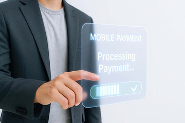 Mobile payment technology concept with businessman using futuristic transparent digital interface for processing transaction securely and efficiently