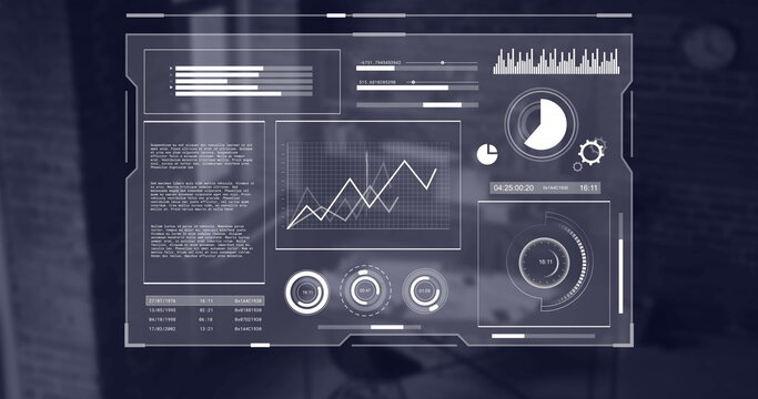 Image of interface with data processing against empty office