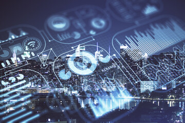 Double exposure of technology theme hologram and cityscape background. Concept of Hightech.