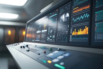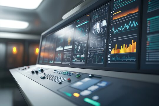 Futuristic control panel with multiple screens displaying data analytics and graphs.