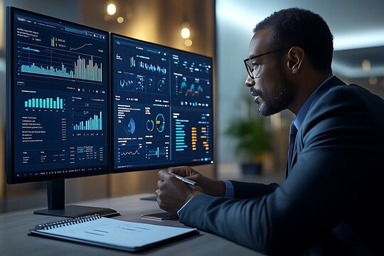 A focused professional analyzes data on multiple screens in a modern office setting.