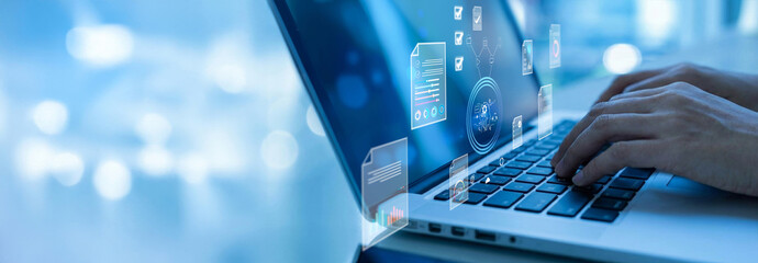 Hand with document icons and typing to laptop computer, Online documentation database and document management system concept. Process automation to efficiently manage files.