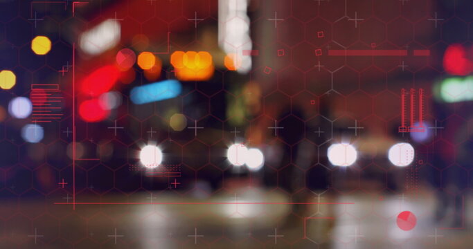 Digital financial analytics in urban skyline at night