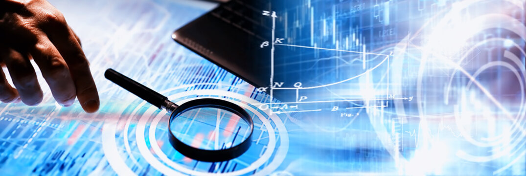 Digital financial data analysis on blue background