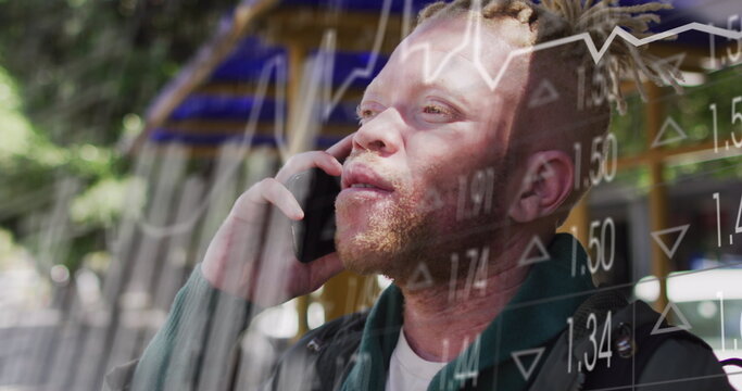 Image of data processing over albino african american man using smartphone