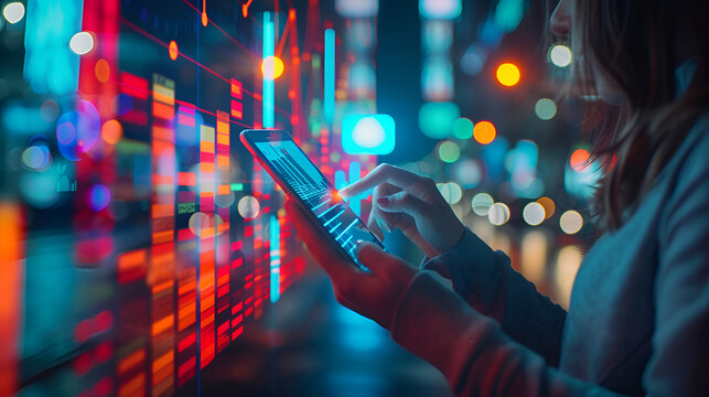 A businessman in a suit uses a tablet to interact with a digital cloud interface, showcasing data uploading and analytics in a vibrant cityscape at night. Gantry