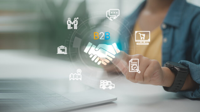 Businessman using smartphone with B2B business to business collaboration, digital trade, supply chain, and corporate partnership technology for growth and innovation.
