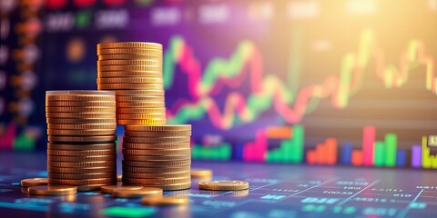 Stacked coins with overlaid financial charts and data, digital, bull