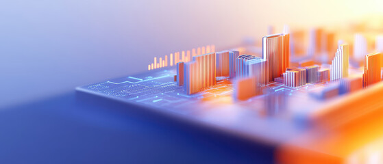Abstract glowing financial chart with bars and lines over futuristic cityscape background, in a creative digital style. Concept of business growth. Ai generative
