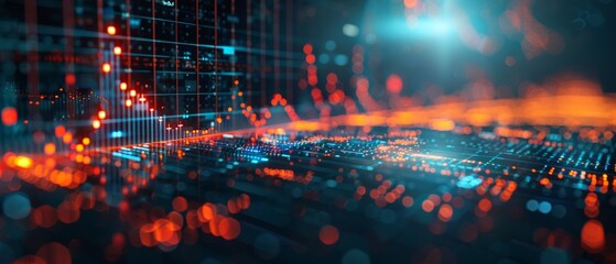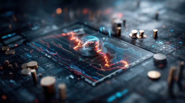 High tech visualization of stock market analysis with glowing graphs and data. intricate circuit board background enhances futuristic feel of financial technology