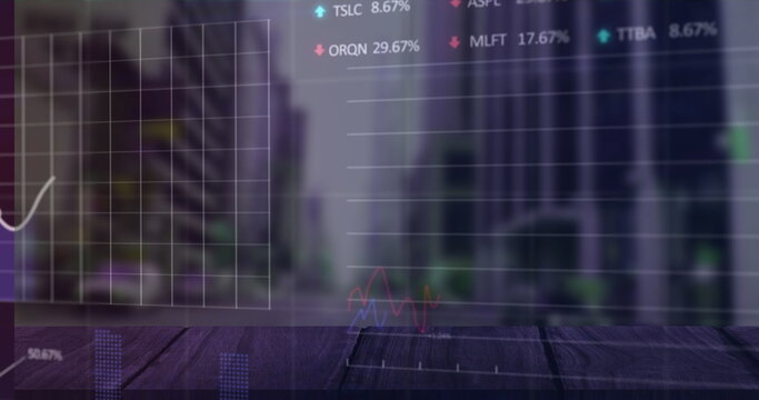 Displaying transparent financial overlay over urban street scene with wood tabletop and data labels