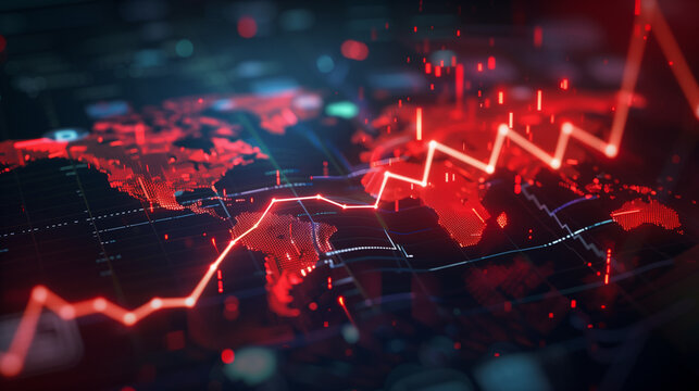 Displaying dotted global map and digital globe, neon financial line charts glowing red endpoint