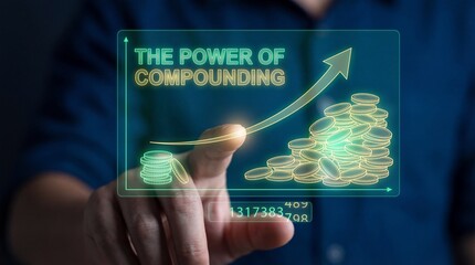 The power of compounding illustrated with glowing coins and growth arrow