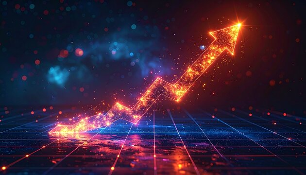 Glowing digital arrow showing upward trend, business growth, financial success, and technological advancement on a futuristic data grid background.