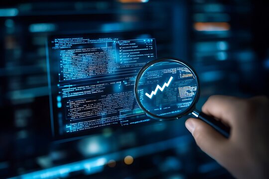 Magnifying glass over rising graph on digital screen, dark blue server room background, financial analysis concept.