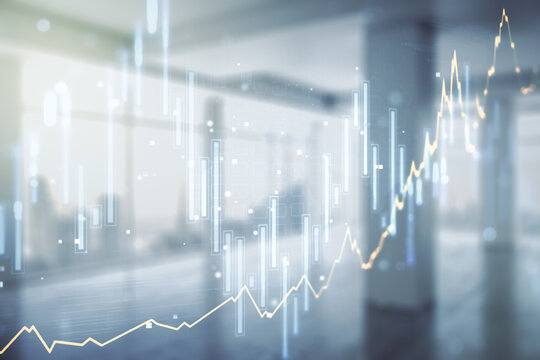 Multi exposure of abstract virtual financial graph hologram on empty corporate office background, forex and investment concept