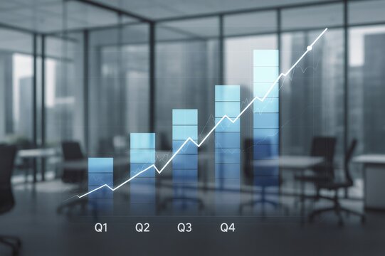 Modern Office Space with Financial Growth Overlay: Business, Investment, and Market Success Concept
