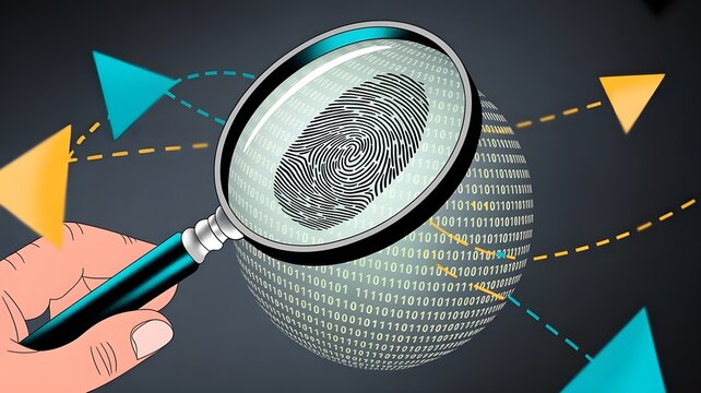 Digital forensics magnifying glass over binary code sphere revealing fingerprint, sleek cybersecurity investigation concept illustration on dark gray