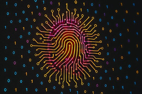 Digital fingerprint concept on futuristic background with glowing lines and binary code representing security and technology