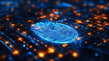 A digital fingerprint glows against a circuit board background, symbolizing security and technology in biometric identification.