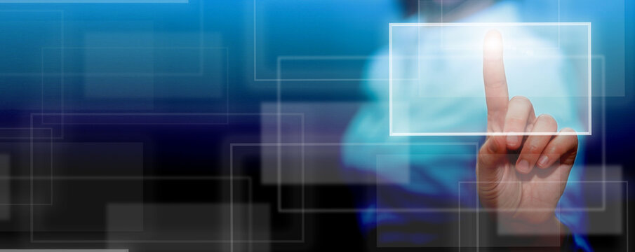 Human finger touching digital touch device screen. Identity, Verification, Fingerprint, Key concept background. Copy space.