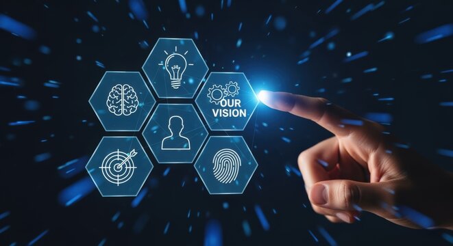 Business vision strategy concept represented by glowing icons, a hand touching digital display, and a dark background