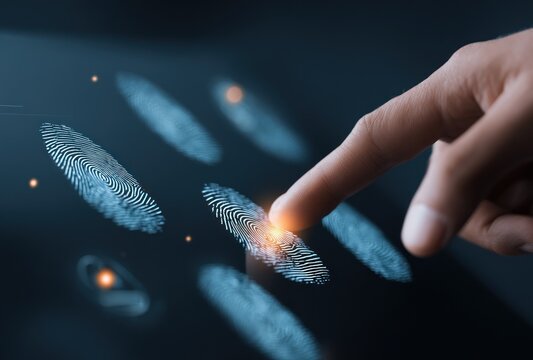 Detailed  shot captures a glowing fingertip touching a digital fingerprint display, highlighting biometric authentication with a futuristic and technological aesthetic against a dark backdrop,...
