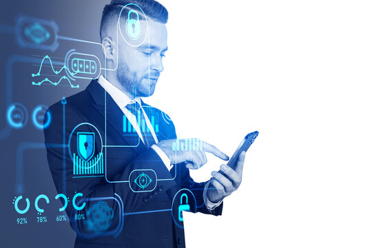 Businessman using phone, digital cybersecurity chart with statistics. Copy space