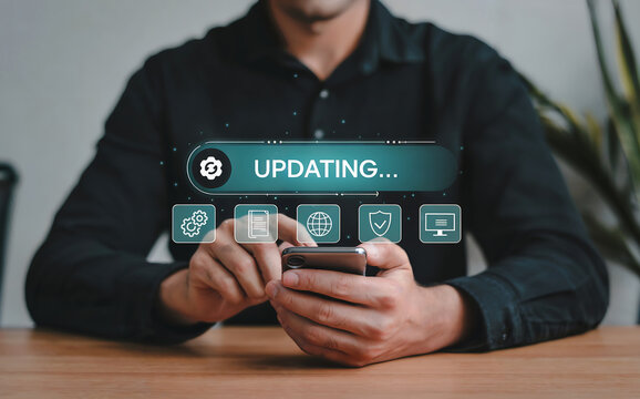 Closeup of a persons hands interacting with a smartphone, displaying a digital updating status bar and icons, signifying a software or system update in progress
