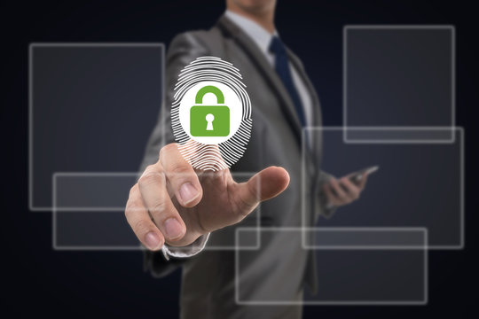 Businessman Fingerprint scan and pressing modern technology lock security over the dark blue background, Business Technology sceurity Concept.