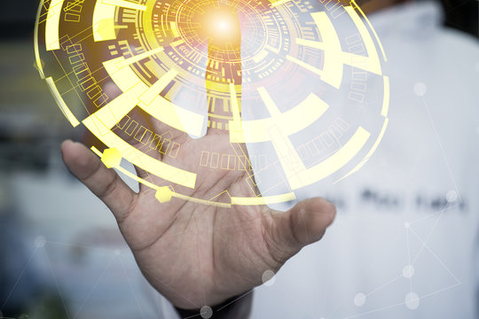 Innovation technology business for simulation Futuristic concept. Businessman pressing digital HUD screen button touching presented symbol connected icons over technologies. Idea on Internet of things