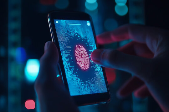 Biometric fingerprint scanning on smartphone, secure authentication, technology concept, data protection, mobile security, identity verification, futuristic digital interface