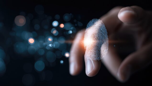 Fingertip interacts with a holographic fingerprint, surrounded by digital icons