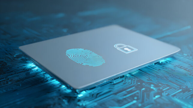 Digital security padlock with fingerprint on futuristic circuit board
