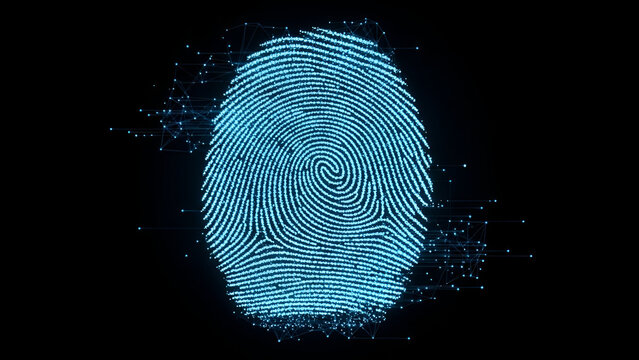 Digital representation of a glowing blue biometric fingerprint scan composed of connected nodes and data points symbolizing secure identity verification and access control technology in darkness