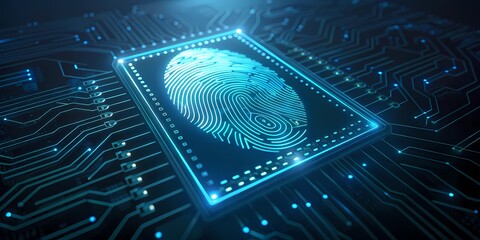 A futuristic blue digital fingerprint on a circuit board, symbolizing cybersecurity and biometric identity verification.