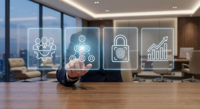 A group of professionals engaged in a business meeting discussing cybersecurity innovations. The digital fingerprint symbolizes advanced security technology in a modern workspace. Trope